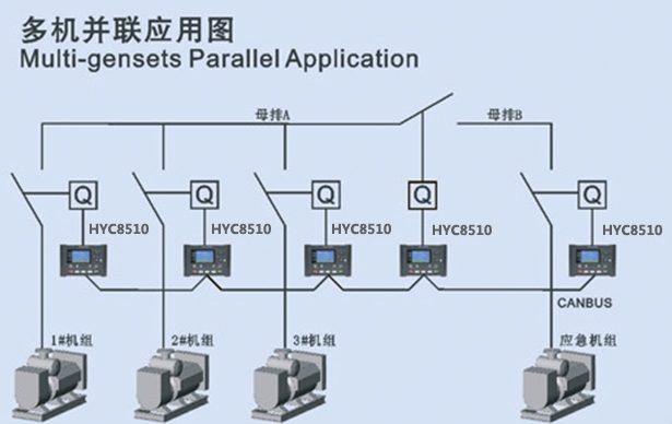宏义HYC8510 并联保护控制器具有控制 GOV 和 AVR 的功能,可以自动同步及负荷均分,和装有宏义HYC8510 控制器的发电机组进行并联。控制器准确监测发电机组的各种工作状态,当发电机组工作异常时自动从母排解列,关闭发电机组,同时将故障状态显示在 LCD 上。控制器带有SAE J1939接口,可和具有J1939接口的多种电喷发动机ECU进行通信。